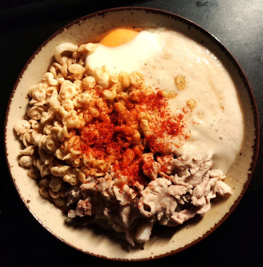 うどんを食べる時はとろろと七味は欠かせないですね。とろろは長芋を擦ってもいいんですが、平日とかは流石にめんどくさいのでセブンイレブンのとろろを使っています。セブンのとろろはマジで美味いですよ。値段も150円ちょっとで買えるんでリーズナブル。そして七味は全力で振りかけます。今回は切らしていたので一味で代用していますが、やっぱり七味の方が香りが立って好きです。肉は豚肉なんですが、これに関しては入れなくてもどっちでもいいですね。僕のうどん汁の場合は甘じょっぱいので、牛肉の方が美味しいかもしれません。