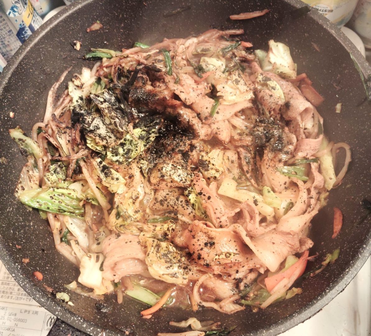 まぁ仕方がありません。因みに焦げているのは、竹炭パウダーをまぶしてバーナーで炙ったからです。炭火の香りがたってより美味しくなります。美味しいは美味しいんですが、やっぱり中華鍋とかで短時間で火を入れないと野菜から水分が出て食感が微妙になってしまいますね。あとシンプルにフライパンのサイズに対して野菜の量が多すぎる。均等に火が入れにくいので余計に水分が出ちゃいますよね。